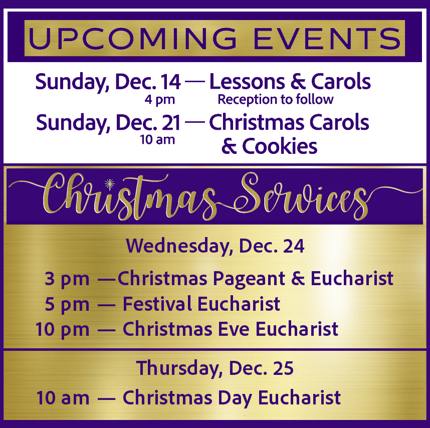 Everyone is invited to a special holiday celebration through Lessons & Carols on Sunday, Dec. 14, at 4 pm, with a reception to follow. Invite your friends and neighbors to join us.
