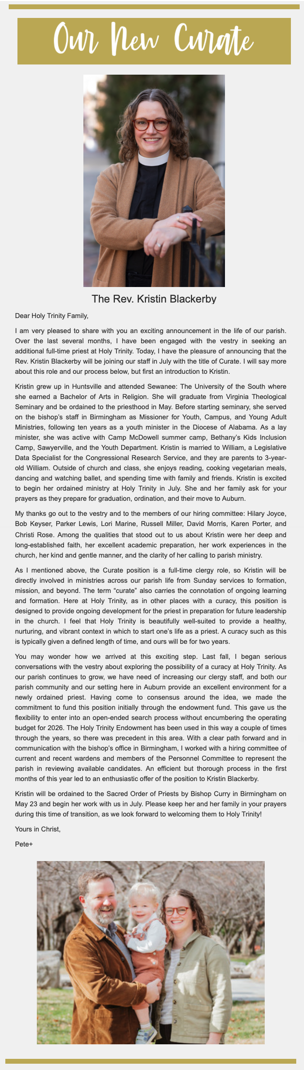Father Pete continues his close collaboration with Holy Trinity Episcopal Day School, which this year brought renewed focus on campus safety. A newly formed Safety Committee is implementing enhanced security practices across all church activities.