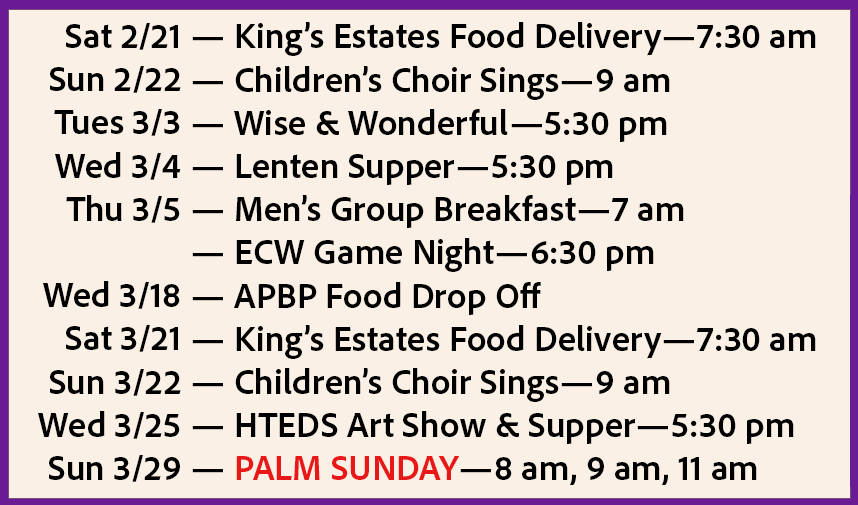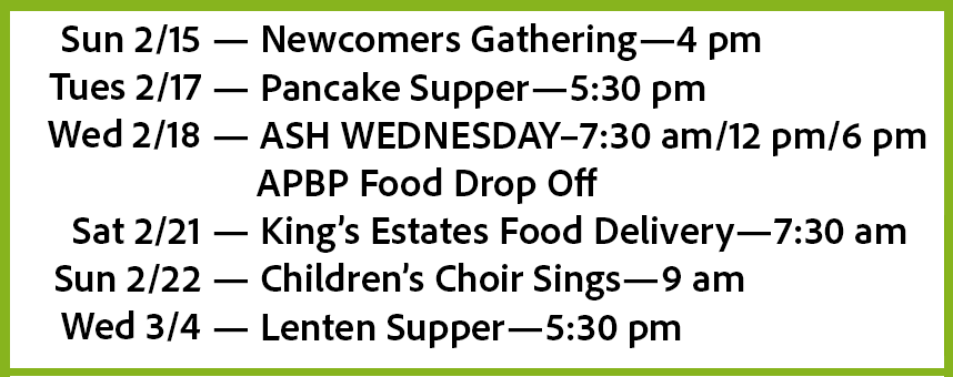 Join your parish friends and dig in for one last indulgence before Lent begins! Holy Trinity’s Annual Pancake Supper will be held on Tuesday, Feb. 17, from 5:30–7 pm in the Parish Hall. Come hungry and enjoy good food and fellowship as we prepare our hearts for the season ahead.