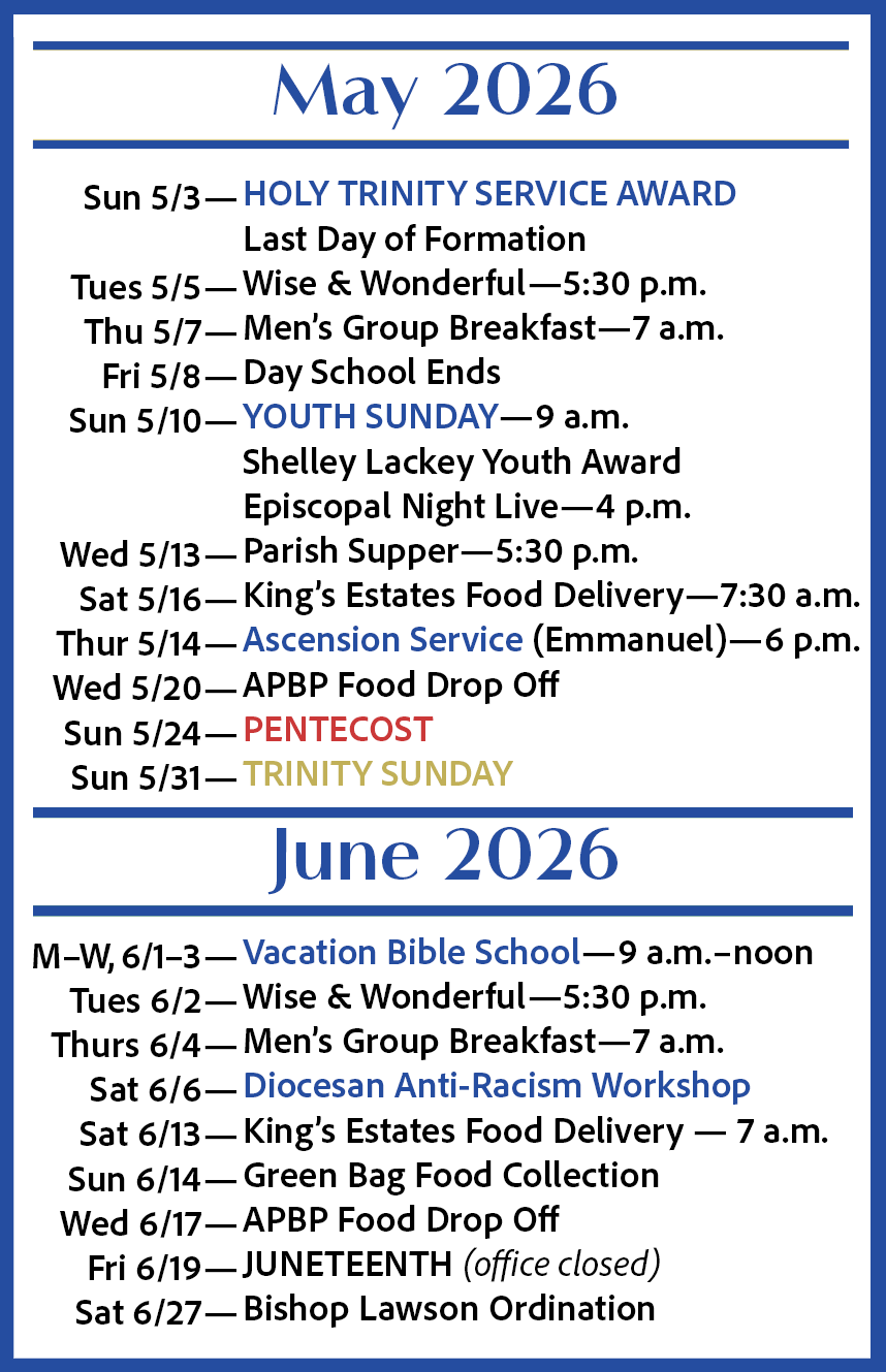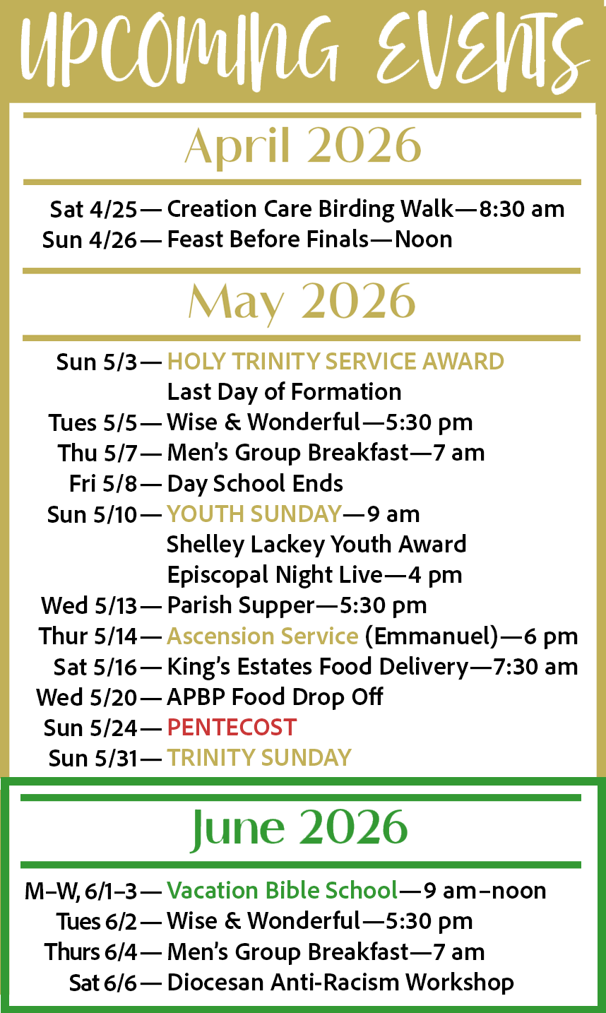 Mark your calendars! Holy Trinity’s Vacation Bible School 2026 will take place June 1–3, from 9 am to noon, for children ages 4 through rising 5th graders.